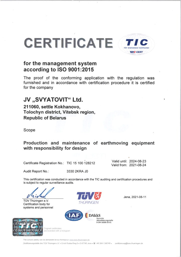 The certification was carried out by a partner of the systems certification body TÜV Thüringen e.V. (Germany). The certificate from the world leader in conformity assessment demonstrates the high level of organization of the production and service processes for earthmoving equipment.